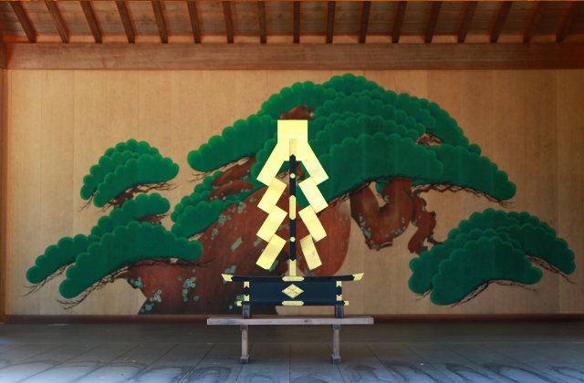また、能舞台の中央には「大きな松」が描かれています。これは、奈良の春日大社にある「影向(ようごう)の松」をモチーフとしたもので、この松は神仏の「通路」、すなわち「依代(よりしろ)」とされてきたものでした。能は単なる娯楽ではなく、神仏のパワーを引き寄せるための呪術に源を発しているため、神仏を導く松の木が、今も能の舞台に描かれているのです。